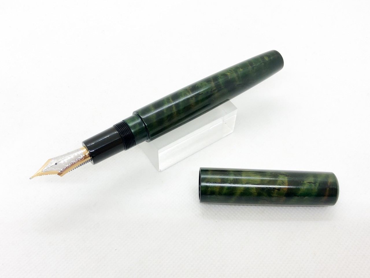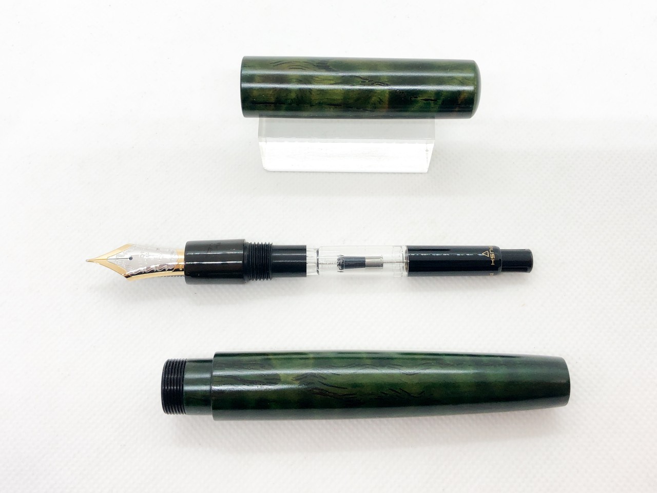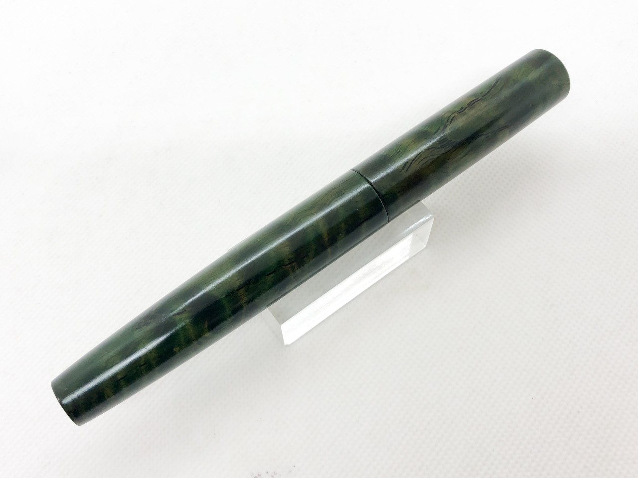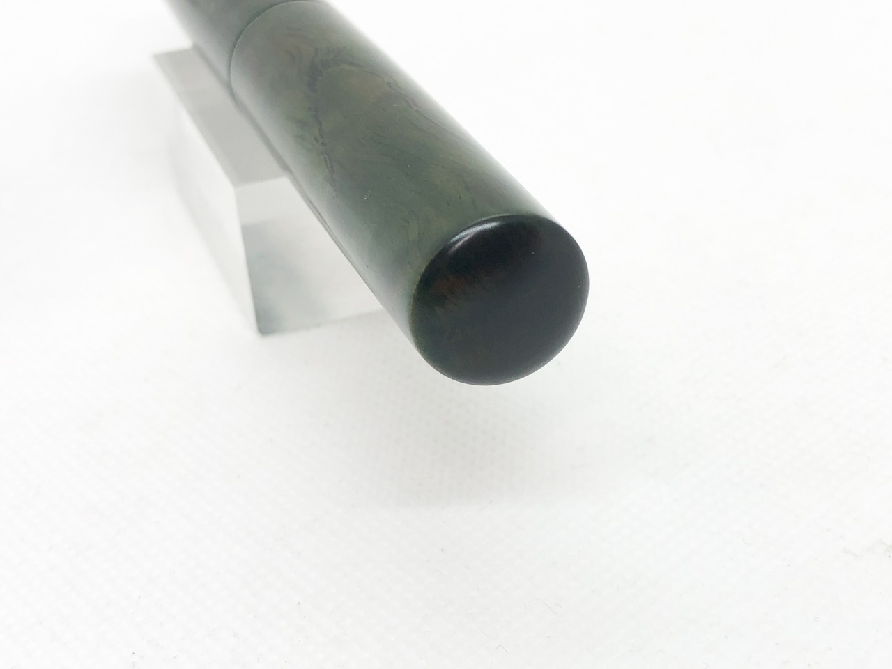 作家の数野氏自らが日本製拭き漆を数十回施しています。漆から出る柔らかな深い緑の色合いが上品な万年筆となっています。数十回の拭き漆のため、表面のまだら模様は1本1本異なっており自分だけの模様を楽しむことができます。
