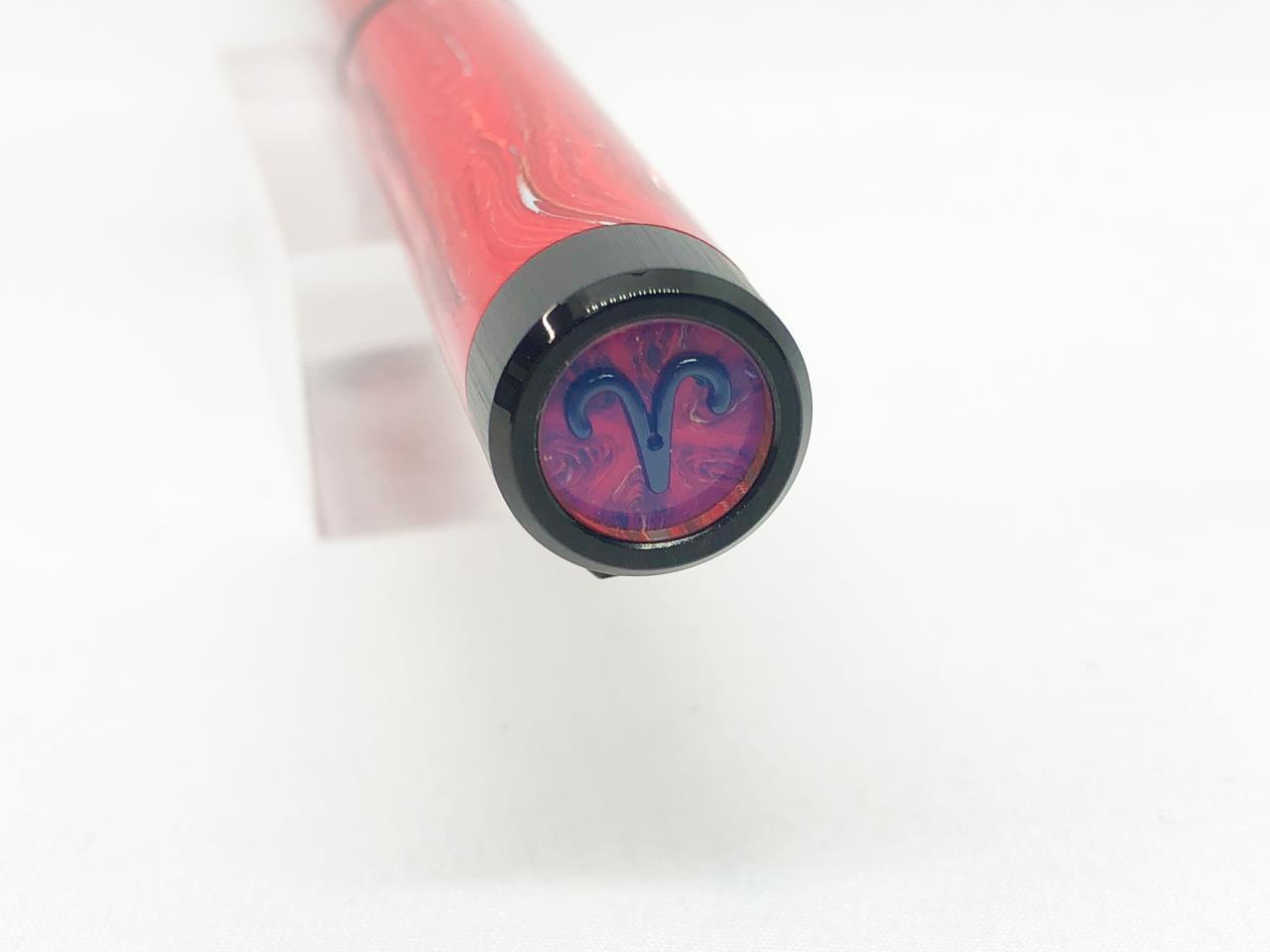 各星座ごとに異なる色や模様のオリジナル樹脂「モンテグラッパイト」を手作業でブレンドした軸となっています。今回買取した牡羊座は真っ赤なボディに様々な色がミックスされているデザイン性の高い万年筆で、持っていると力がみなぎるような印象を受けます。