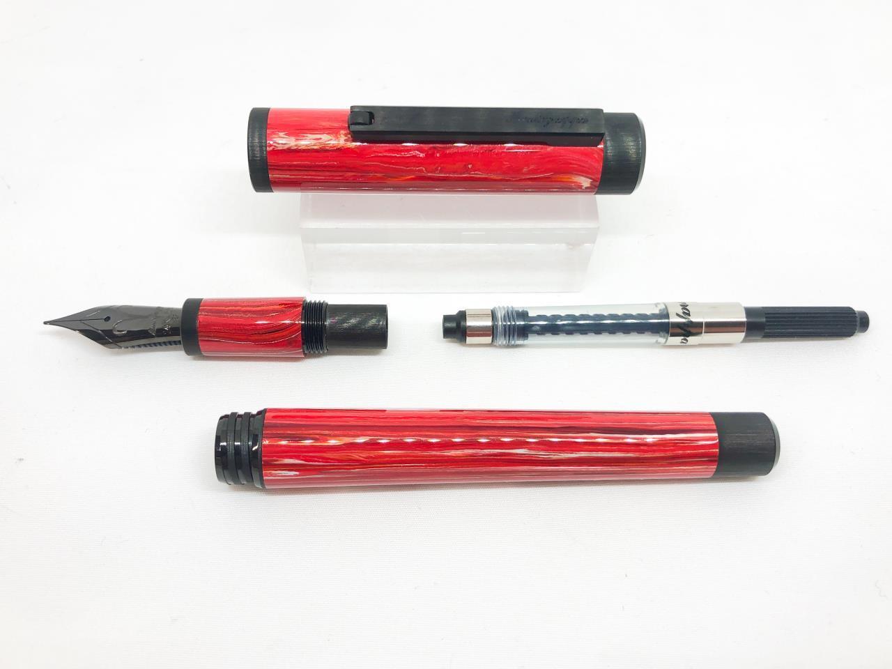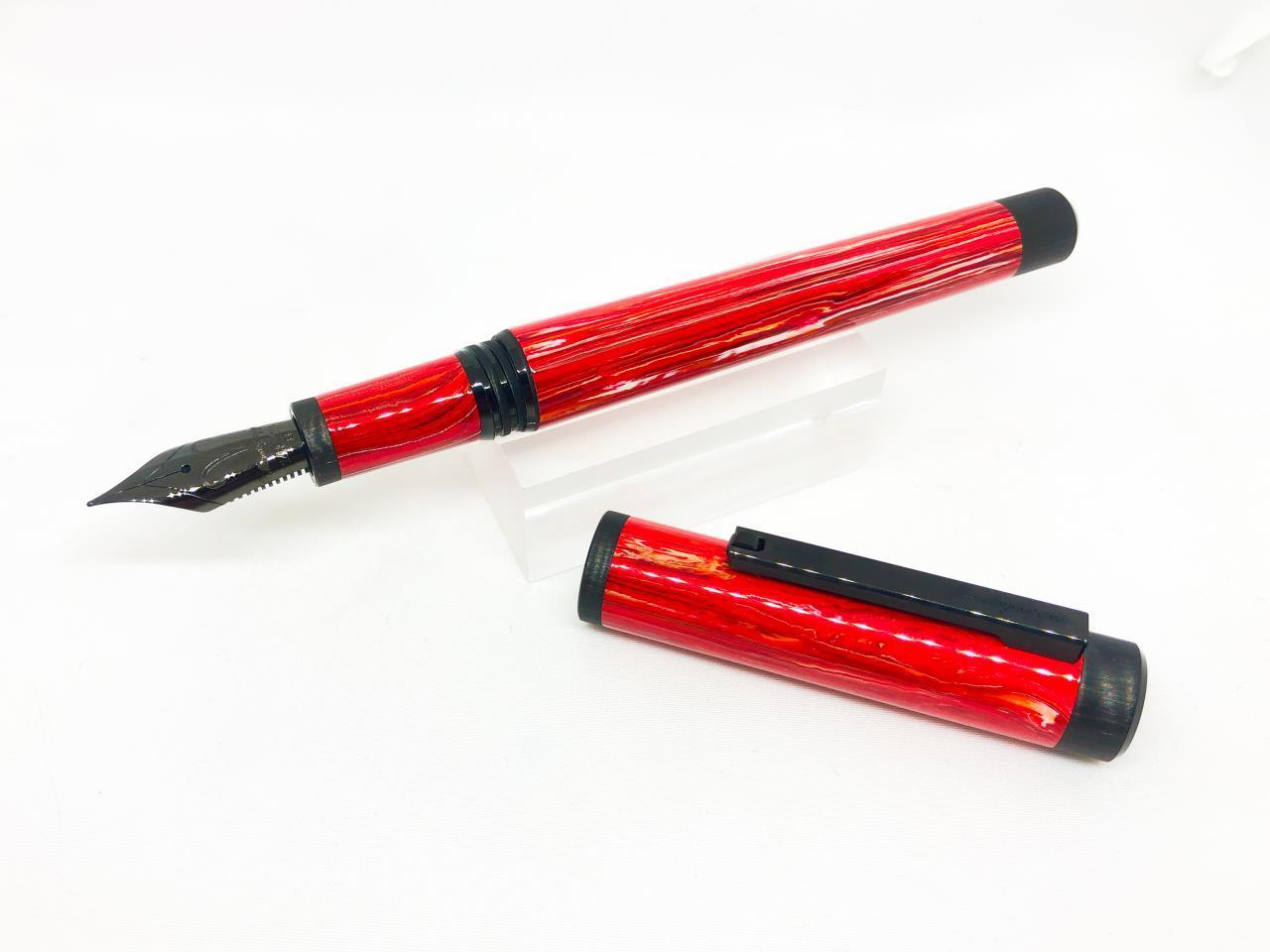 モンテグラッパイトの調合は手作業のため、この牡羊座も赤をベースとした色合いに白やオレンジが混ざっており、生産された個体一つとして同じ表情を持たないと言われています。そのため、自分だけの万年筆として色見を楽しめるのが特徴です。
